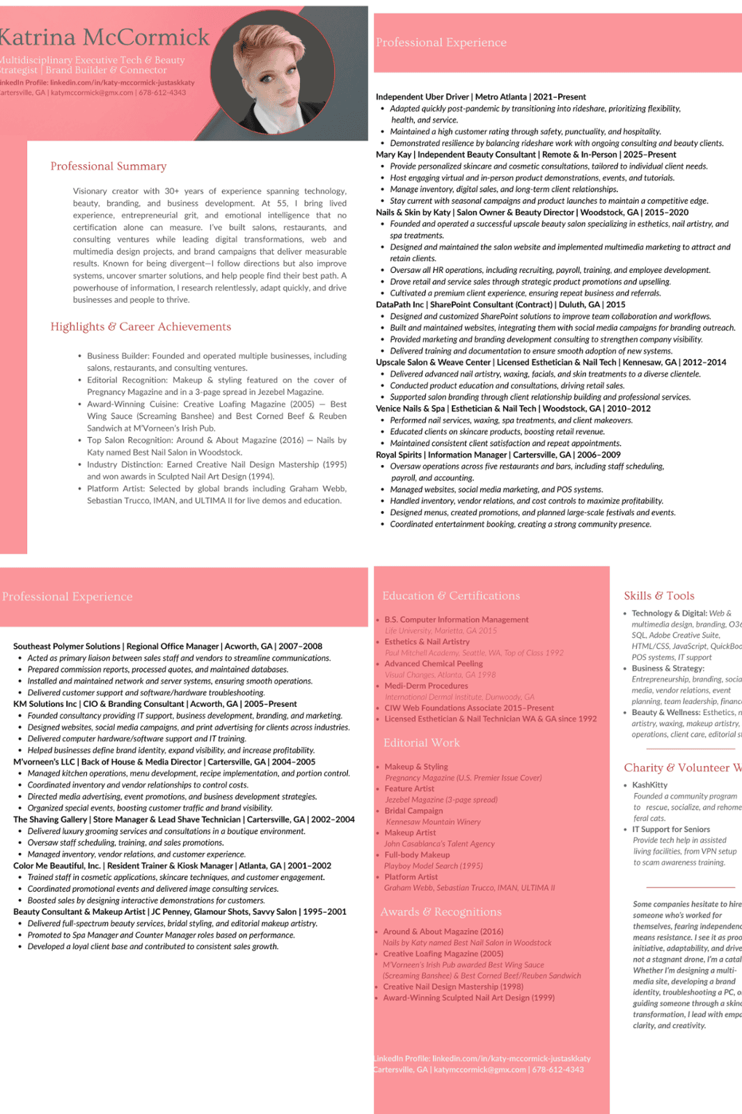 I’ve spent my life blending creativity with problem-solving — whether it’s building salons and restaurants, designing web projects, or helping someone feel more confident through beauty and wellness. I believe success isn’t just about titles or certifications, it’s about adaptability, heart, and the people you serve. I love connecting with others, improving systems, and finding practical ways to make life and business run better.